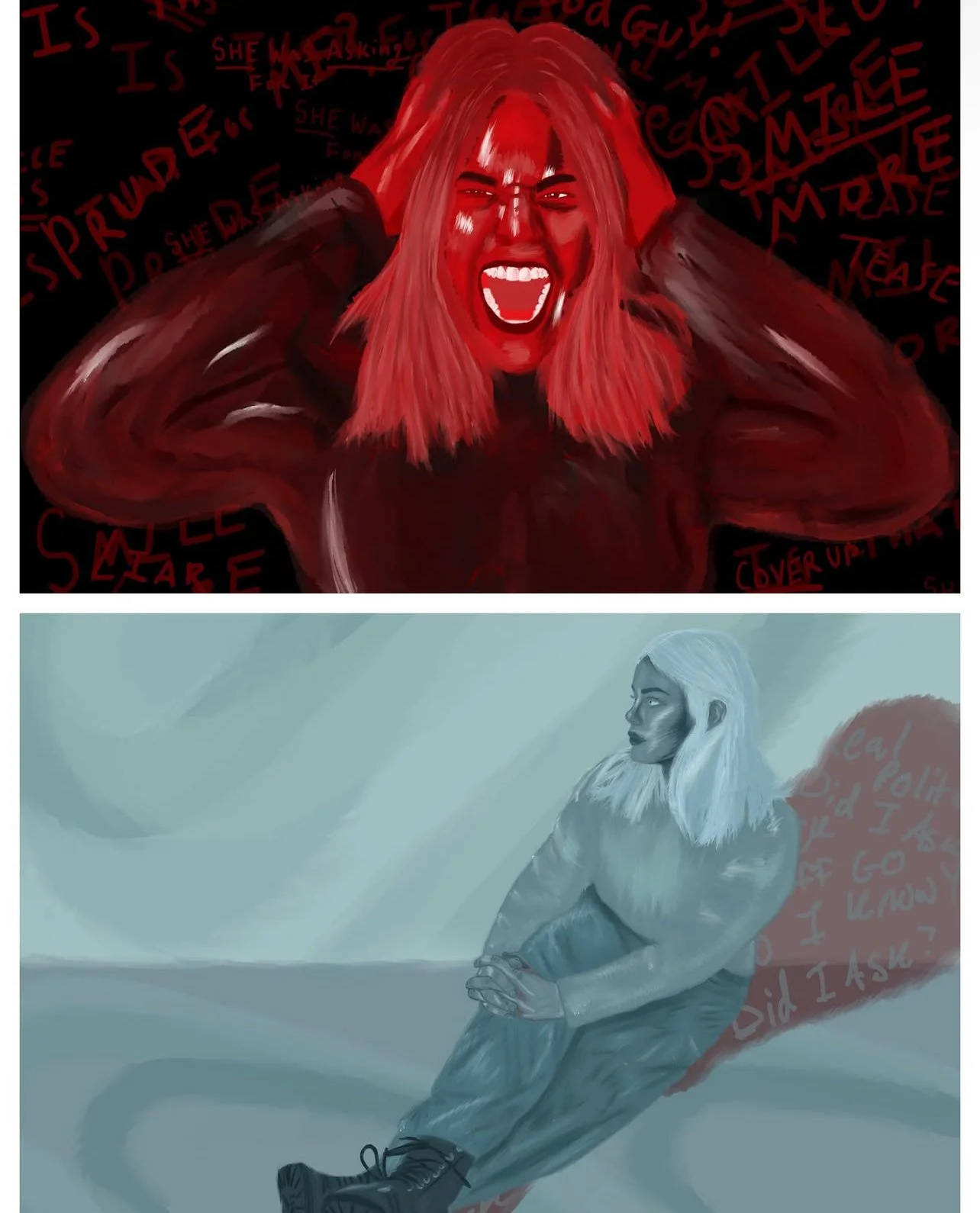Feminine Rage Mediums used: Digital Painting, Adobe Photoshop This piece shows the duality of feminine rage. "Lashing out" vs. suffering in silence.
